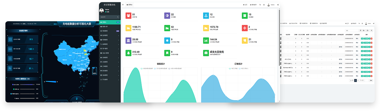 运营管理人员实现分销管理、设备管理、充电卡管理、订单管理、财务管理,运营数据统计查看,实现管理高效、实时监控财务数据。