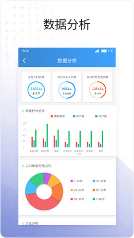 根据各个企业、村居等上报采集的数据进行融合和提取,自动对数据在手机端进行分析、分类和汇总,APP内通过饼状图、柱状图和曲线图等各种动态可视图形进行数据展示及分析